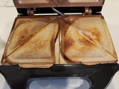 [This review was collected as part of a promotion.] I love this sandwich grill! You can make two sandwiches at the same time and nothing stickes even without non stick cooking spray. It seals the breads on the edges and in the middle forming two pouches full of goodness inside.