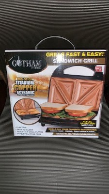 [This review was collected as part of a promotion.] We got this Gotham Steel Sandwich Grill a few weeks ago so my son can make his own grilled sandwiches without having to use the stove. This grill is very compact but cooks two sandwiches at once and we couldn't be happier with it. It takes up very little room in the cabinet, heats up quickly and is really easy to clean if cheese gets loose. The bread browns nicely on the outside while heating up the contents. This grill is great for traveling because of its size. Would definitely recommend it.