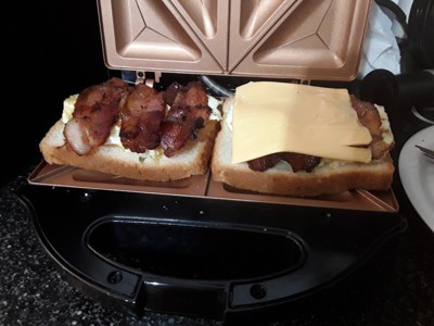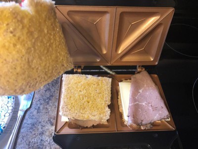 [This review was collected as part of a promotion.] I bought this product and it is the best ever. Its very light, easy too store, very easy too clean. Absolutely love how easy too assemble a sandwich, very easy too toast your food. The direction is very easy too follow. The cheese stay in the sandwich.