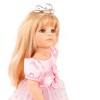 - She wears a pink satin dress with silver glitter hearts, a pink sash at her waist, matching shoes and a silver tiara. Additional outfit includes white t-shirt, jeans, belt and floral canvas sandals. Hannah can wear most 18" doll clothing and footwear, including those in the Gotz 18" collection.
