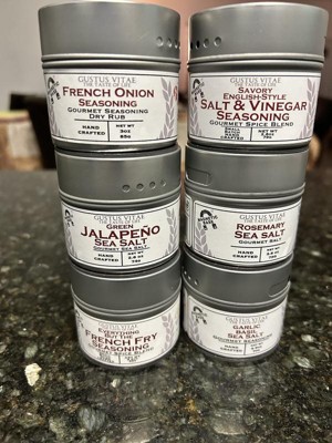 - English-Style Savory Salt & Vinegar Seasoning: Garlic, Sea Salt, Vinegar (White Distilled Vinegar, Maltodextrin), Rosemary, Parsley, Thyme, Chili Pepper, White Pepper.