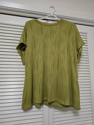 [This review was collected as part of a promotion.] Really cute and well made. The textured pattern adds a fun touch to a great basic everyday top. Material feels nice, and has a slight bit of stretch. Unfortunately no model photos as it didn’t fit me quite right - I’m typically between an XL and a 2X depending on brand, this seems to run true to size as I received a 1X and would’ve preferred a 2X.