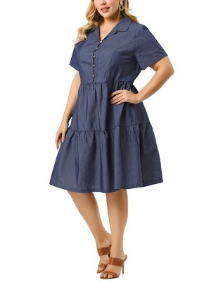 Women's Plus Size Lapel Short Sleeve Button Down Casual Midi Denim Dress with Pockets - Agnes Orinda - 1 of 4