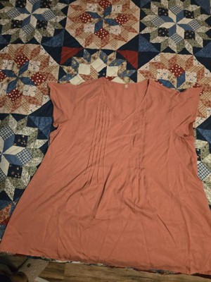 V-neck blouses for women with ruffle sleeves, topstitched tucks in front, curved hem, casual loose fit tee with flutter trim, smocked tops