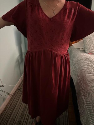 V neckline, ruffle short sleeve, Embroidered panel detail at chest, high waist and elastic waist, back middle seam, above the knee, loose fit, and swing hem