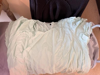 V neck cut with ruffled short sleeves, smocked shoulder details add a three dimensional feel, solid color style is simple and versatile