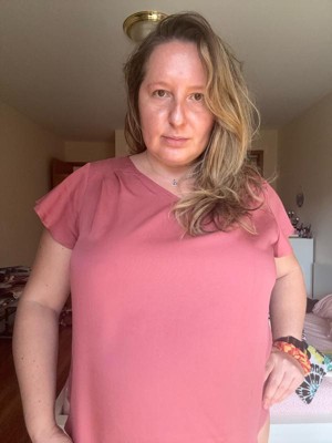 [This review was collected as part of a promotion.] It’s a comfortable top with a pretty design and is very stylish. I love the V-neck and the detailing on the sleeves. The mauve color is also nice and is very in right now. The fit is true to size and the fabric is thick. I would appreciate a tiny bit of stretch in the material, as us plus size girlies like that little bit of comfort.