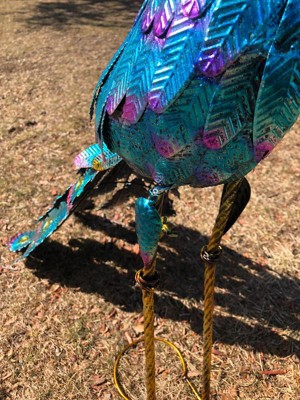 [This review was collected as part of a promotion.] I love this Metallic Peacock! It was very easy to put together by myself. The colors are so vivid and sparkly in the sun. I placed a brick behind the legs so it doesn't tip over in the wind. I've already received compliments on it! Would definitely recommend!