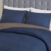 Transform your bedroom with this versatile reversible quilt set. The crinkled fabric design in calming gray adds texture and dimension, while the solid taupe reverse with channel stitching complements the quilt's style, making it perfect for any bedroom decor. This 3-piece set, complete with 2 matching shams, is ideal on its own or as a stylish layer for extra warmth during chilly nights. Embrace casual comfort and coordinated style with this farmhouse-inspired quilt set.
