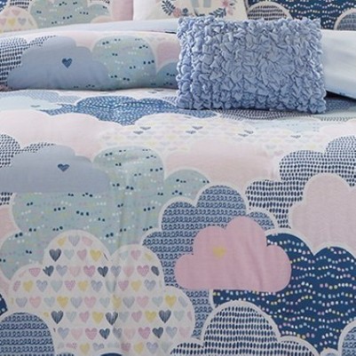 Bring a whimsical touch to bedtime with the Cotton Comforter Set. Featuring a cute and fluffy cloud motif in soft, colorful tones, this set includes a reversible comforter, shams, and decorative pillows with charming details like all-over ruching and an embroidered unicorn. Made from 100% pre-shrunk cotton, it's hypoallergenic, bed-ready, and OEKO-TEX certified for safety. Enjoy dreamy nights with this delightful, antimicrobial comforter set.