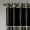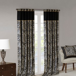 Transform your space with a touch of opulent, timeless style using our Window Curtain Pair. The mesmerizing jacquard weave takes inspiration from a modern paisley motif, intricately woven in captivating shades of black, gold, and a hint of platinum for a dazzling touch. These window panels are meticulously pieced with solid faux silk, enhanced with exquisite flat piping details in gold, delivering an elegant and refined aesthetic. Furthermore, the attainment of the OEKO-TEX certification ensures the absence of harmful substances or chemicals, promising quality comfort and wellness. The rod pocket or back tabs top finish facilitates easy hanging, opening, and closing of the panels throughout the day, accommodating a standard 1.25" diameter rod. For a coordinated look, explore our range of matching bedding, available separately.