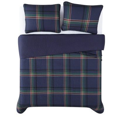 - Plaid reversible quilt set in blue, green, and white colors