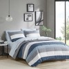 - Stripe comforter look in grey, navy, blue for casual and modern bedroom style with simple coordinating stripe design on sheet set