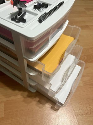 [This review was collected as part of a promotion.] The 4 drawer chest is perfect for keeping our arts & crafts supplies organized! I love that the drawers are clear so you can see what’s inside without having to open each drawer. Regular paper fits perfectly into the drawers and each of the drawers holds about a ream of paper. The drawer chest is lightweight and despite being entirely made out of plastic, it is surprisingly sturdy. The organizer top is a nice feature and something I haven’t seen before. It is great for storing smaller items such as pens, paper or binder clips and keeping them organized.