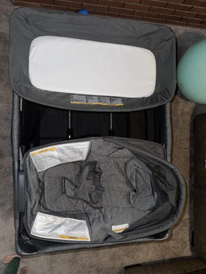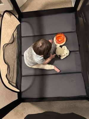 [This review was collected as part of a promotion.] After a couple of rambunctious kids, we needed to replace our pack and play. I didn’t realize how much we would also be upgrading! This thing is sturdy and beautiful. I love the classic colors — baby gear that can blend in is so nice!the side zip opening is so clever for toddlers who are used to some independence. And it’s gotta be easier on my back! The bouncer chair is easy to move and has an ample sun shade — it’s been great for brining baby outside for fresh air while the big kids play. I think it’s great that it was included — you’re gonna need a bouncer chair for baby at some point, this makes the whole thing a solid value. My husband was able to set the whole thing up in less than 10 minutes the first time. But how he can set it up or pack it away in under 5.