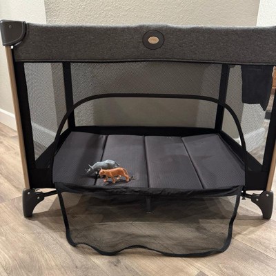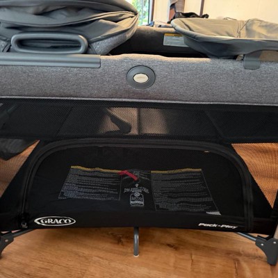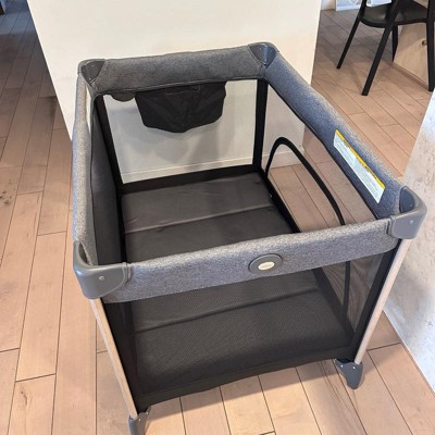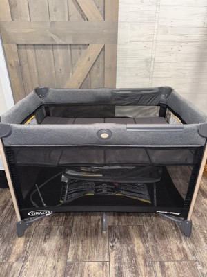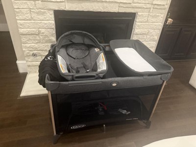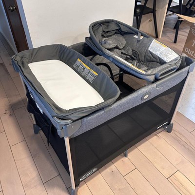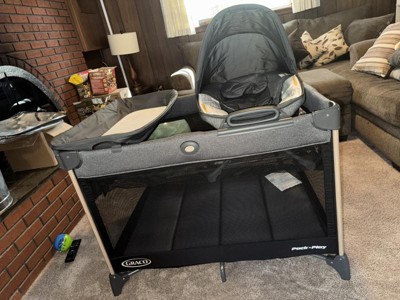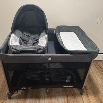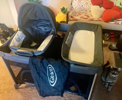[This review was collected as part of a promotion.] wow this graco play yard has a lot of features! it’s aesthetic black and neutral coloring is minimalist even a avoiding the usual silver side posts and instead making them a faux white oak shade. it’s pretty light weight would be easy to lift without the top attachments. unfortunately the changing attachments and bassinet top don’t quite fit in the carrying case but neither do any others that i’ve seen or tried. would be nice, a mom can dream! this entire setup is very… secure. there is a lot of snaps and buttons and posts which may either help make you feel better about your babies safety or drive you a little nuts remembering all the places to click and snap and unsnap each time you set up and take down. that would be for me the only negative on this product. notably the bassinet top zips on which again is very secure but requires slightly more time putting on and taking off and you do need to do this to attach the changing pad and additional seat. all in all - great product!