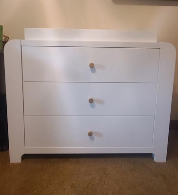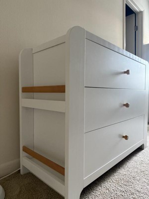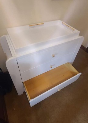 [This review was collected as part of a promotion.] This is the perfect dresser for a nursery and will grow with your child when they are out of the diaper phase as well. The dresser has three large drawers for storage. I love the fact that if you have one drawer open you are unable to open any of the other drawers. This helps keep the weight balanced and hopefully prevent children climbing up and potentially toppling it over on themselves. The top has a changing table piece that can easily be removed without any sign it was ever there -screws in on the back. (Changing pad not included). Also love that both of the sides have two racks for book storage or even some smaller stuffed animals. Even though the dresser appears to be more for infants with the changing table you could use this for years to come and even for college. The changing table piece is the last piece added when putting together so can easily skip those steps. The step by step directions were easy to follow and able to put together by myself in a couple hours.