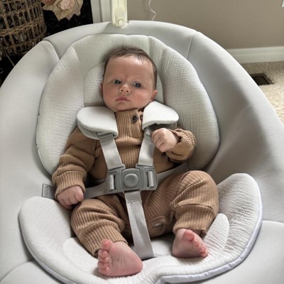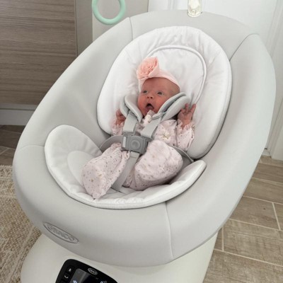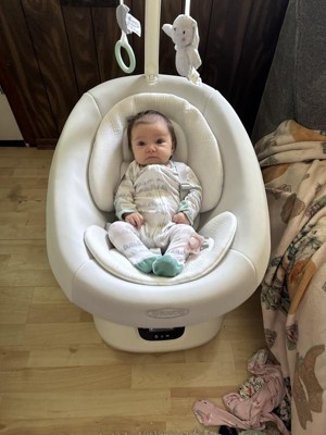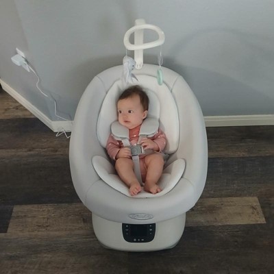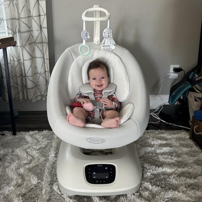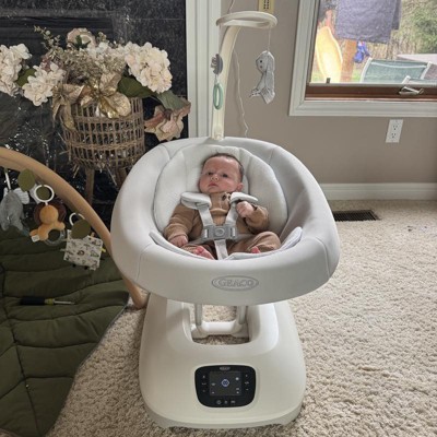 The Graco SmartSense Soothing Baby Swing starts to soothe your baby in seconds, with technology that hears your baby's cries and responds with calming sound and motion. This baby swing offers thousands of combinations of gentle motions, soft vibration, multiple speeds, white noise, and calming music to help create more peaceful, happy moments for you and your baby. Swing, rock, cradle, and glide motions mimic the way parents naturally soothe their babies, while a cozy body support made with organic cotton fabrics helps keep baby comfortably snug. Three recline positions allow you to customize the swing to what your baby likes best, and a toybar adds additional interest for curious little hands and eyes. The 5-point harness keeps your child secure. SmartSense is the winner of the 2025 Parents Best for Baby Awards and the Motherhood Community Awards: Best Swing of 2025.