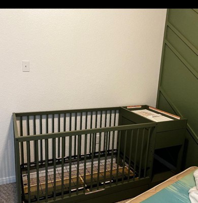 [This review was collected as part of a promotion.] I absolutely love this crib. It was so simple to put together. It’s extremely sturdy has tons of storage. The changing pad is nice and thick mattress fits on it perfectly baby. Absolutely loves it. I love that. It’s a five and one so it will grow with my child. The olive color goes great with my decor and it’ll also go great for the decor as a child’s change in taste develops, and she gets older.