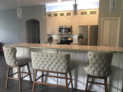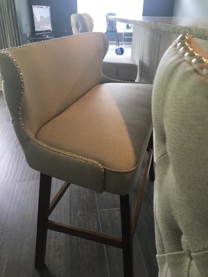 Beautiful bar stool bench. This is taller than the regular counter Height. I was unable to find a tufted counter height bench and decided to go with this one. NO REGRETS. Got about 3 1/2-4 inches cut off the legs and it fits my counter height table perfectly. Sprayed some fabric protector on it and it did not stain or change color. Absolutely stunning. Matches 4 tufted bar stools that I found at a local store perfectly.