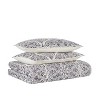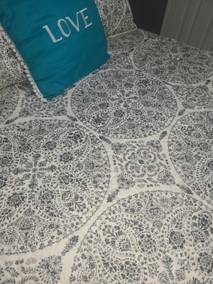 This stunning printed bedding set features a watercolor medallion print that is elevated by the paisley pattern within that brings a modern feel to a classic design. The dark blue pattern provides a sense of serenity and is brightened by accents of purple, reversing to a cream color. Complete with matching shams, this set has everything you need to complete the look of any bedroom. The soft, silky feel to this set is provided by the 100% microfiber fabric that is easy to maintain and machine washable. Quilt face is a printed 85 GSM microfiber polyester fabric that reverses to a 85 GSM solid microfiber with multi needle quilting. The quilt is filled with 200GSM filling made of 51% cotton and 49% polyester. This item is machine washable; however, please make sure equipment is large enough to allow the item to move freely in wash. This item is imported from China. Set includes: one quilt 90 inches wide by 90 inches long and two standard shams 20 inches tall by 26 inches wide.
