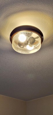 [This review was collected as part of a promotion.] I got the Grand Bank 2 light semi flush Mount light drum design in Auburn stained finish. Its so nice in entry way and I like that it has 2 lights. The dome is glass. The size is 7 1/4high and 12in wide. The band looks like wood but isnt. Its a different look and nice in any room.
