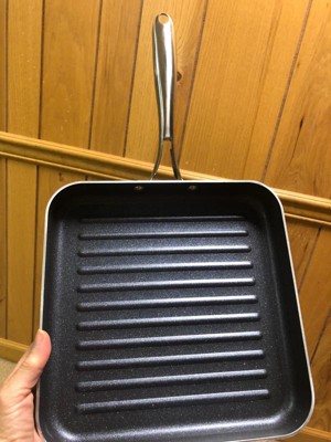 [This review was collected as part of a promotion.] I received this a while ago, and I'm pretty glad that I did. It's very sturdy, it reminds me of the pants that my mom used to get back in the day if you flip it over and see the color of it. I really liked it because it was non-stick, my food came out extremely delicious. The pan is a little heavy but that's not really a big deal. Everything I cooked in it came out good from meat stew veggie. The only thing that I was surprised about is I was expecting to get the grill marks, on my food and I did not get those grill marks on my food, but otherwise I really like the pan. At first I was kind of concerned because it's square and it fits over the entire burner on my stove, but all the Hue food was cooked equally.
