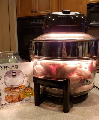 [This review was collected as part of a promotion.] Big Boss oil-less fryer 16 Qt. Convention Countertop Oil-less Oven I have seen and heard good things about air fryers and oil-less fryers for a while and was excited to finally try one for myself! This Big Boss oven did not disappoint! First, the packaging is very secure, all the glass and electronic parts are protected with packing materials that are molded around them. Second, it is bigger than I expected! A huge 16qt cooking area (an included expander ring helps on larger items like a big turkey). Third, I love that it is round and all glass. You can check on things without opening it and disrupting the cooking process. Fourth, the cleanup was quick and easy for a larger kitchen appliance. I used soapy water to quickly rinse the large glass bowl (so that it didn't take up my entire dishwasher shelf), threw the metal rack and metal basket into the dishwasher, and wiped down the lid. Simple! The unit included a recipe book and simple instructions. I would love an even bigger book, but I'm sure I can find things online. For example, we added a bunch of wings, but the instruction book had time and temperature for 6 wings (we were doing about 60-70, we didn't want to do 10 batches). We started with a huge basket full and found it was better to do a packed single layer. You got the nice crisp and perfect cook that way. For anyone else attempting to do a large batch like this, we found it worked great to have a batch in the Big Boss while the rest were getting a partial bake in the oven. Then when the Big Boss had them crisped up just perfect, we would rotate batches of almost done wings from the oven into the Big Boss so that they would have that perfect non soggy cook we were going for. I can't wait to try a bigger item like a whole turkey. We are having fun with it already!