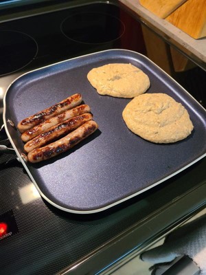 [This review was collected as part of a promotion.] I love making complete breakfasts in this pan. There is enough surface space to fry several eggs and brown corn tortillas at the same time. The surface truly is non stick but also doesn't burn your food. It really does live up to the claims the company makes.