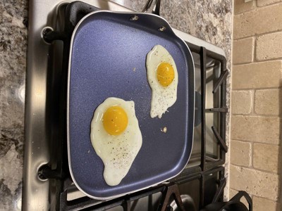 [This review was collected as part of a promotion.] I’ve wanted a pan like this for a while. So far I have only made pancakes and grilled cheese on it but i had no problems with sticking! It’s a really nice deep blue color, well made and definitely nonstick. I look forward to using it more!