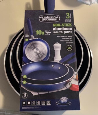 [This review was collected as part of a promotion.] I got Granitestone Diamond 3-Piece Frying Pan Set with Rubber Handle and I love them because it makes cooking fun knowing that they are non-stick/no oil/no butter needed, cool touch rubber handles which are so convenient, very strong/high-quality material that is 10x extra long-lasting, can be used on gas/electric stoves, and looks so good with my decor. I am very satisfied and very proud to own this product.