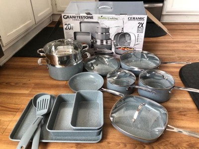 [This review was collected as part of a promotion.] The GraniteStone 20-Piece Cookware and Bakeware Set is a versatile and stylish solution for any cook. Key Features: • Comprehensive Set: Includes a variety of pots, pans, bakeware, and utensils, covering a wide range of cooking and baking needs. • Nonstick Surface: Features a triple-layer, diamond-infused nonstick coating, allowing for cooking with minimal to no oil and facilitating easy cleanup.  • Oven and Dishwasher Safe: Safe for oven use up to 500°F and compatible with dishwashers, adding convenience to your cooking routine.  • Aesthetic Appeal: Available in eye-catching colors like cobalt blue and emerald green, adding a pop of color to your kitchen.  Pros: • Versatility: Suitable for various cooking methods, including searing, steaming, frying, and baking.  • Ease of Cleaning: The nonstick surface ensures that food releases easily, making cleanup a breeze.  • Durable Construction: The aluminum core provides even heat distribution, reducing the chances of hot spots.  Cons: • Handle Design: the metal handles can become hot during cooking. • Scratch Resistance: While the coating is durable, it’s advisable to use non-metal utensils to maintain the integrity of the nonstick surface over time
