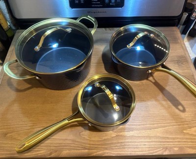 [This review was collected as part of a promotion.] This cookware set is absolutely gorgeous. The gold handles really top it off ! It’s non stock and oven safe. I love that it comes with everything you need ! Perfect if you are just getting started or wanted to revamp your kitchen.