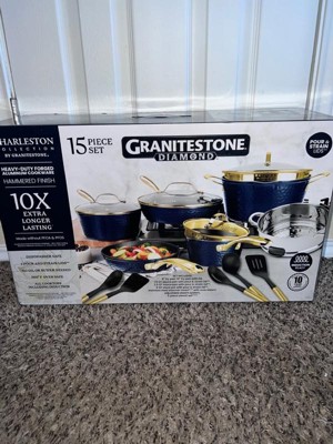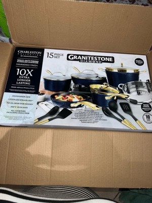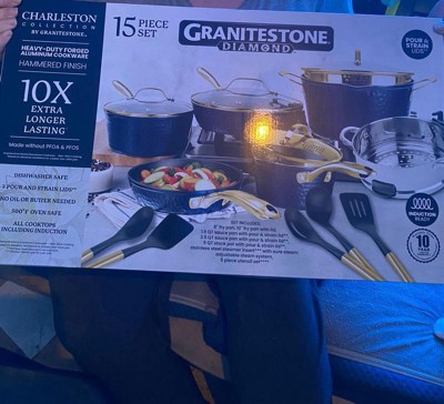 Reimagine weeknight dinners with the 10x longer lasting and ultra durable Granitestone Charleston cookware set. The 15-piece set includes a 8" fry pan, 10" fry pan with lid, 1.5-quart saucepan with lid, 2.5-quart saucepan with lid, 5-quart stock pot with lid, stainless steel steamer basket, and 5-piece utensil set. Crafted with three layers of exceptional durability with a coating that lasts 10x as long as conventional ones, this pot and pan set was made to handle your daily kitchen routines. Its nonstick surface ensures that food effortlessly glides off, while remaining easy to clean. Little to no oil or butter is needed and every piece is made without PFOA, PFOS, lead, or cadmium so they're crafted for healthier cooking goals. A dishwasher safe design that's metal-utensil safe and scratch-resistant makes cooking and cleaning a whole lot easier. Each piece has an induction base and is oven safe up to 500°F so you can cook any way you want. Gold ergonomic handles stay cool to the touch to offer maximum comfort while cooking. To top it off, it has a modern farmhouse look with a hammered design that brings elegance and durability together.