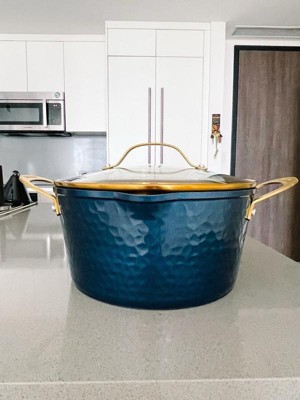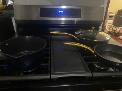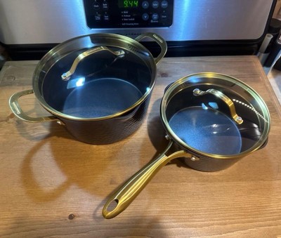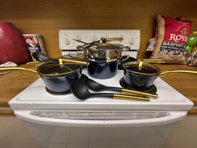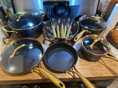 [This review was collected as part of a promotion.] The first thing I noticed when I received this cookware set is how beautiful it looks. The blue tone is stunning and looks very beautiful with the gold. The second thing I noticed is how light the pans and pots feel. The set is perfect to use in induction stovetops but also for oven use. I have never seen any set with these finishes. The utensil set is great to avoid scratching the set. The brand claims the nonstick coating is 10x extra longer lasting, however one of my pans arrived already scratched. Also, butter or oil is not necessary, but I found that some of the food still sticks. The pots and pans have a pour system and the lids have a strain that I love. Overall I would recommend.