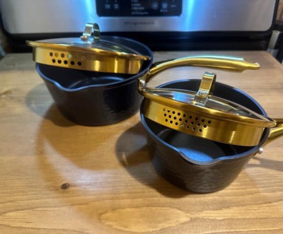 [This review was collected as part of a promotion.] These pots and pans are so elegant. They would make a perfect gift for anyone. They seem sturdy. They have a pourspout and a strainer lid. they come with golden handled utensils that are easy to hold. As far as the negatives, I haven’t seen any. My food goes in and comes out super easy no sticking which is a huge plus. All in all great product highly recommend will be buying more in the future.