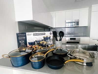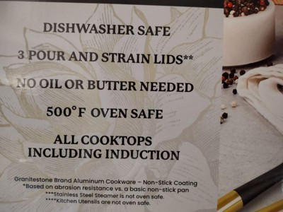 - GRANITESTONE CHARLESTON COLLECTION: A nonstick cookware set that has everything you need for meal prep and busy weeknights. Durable pots and pans are made to last 10x longer and handle the ins and outs of everyday use. They're made to be dishwasher safe and oven safe up to 500ûF. The hammered, modern farmhouse design adds a stylish component to a high-performance set.