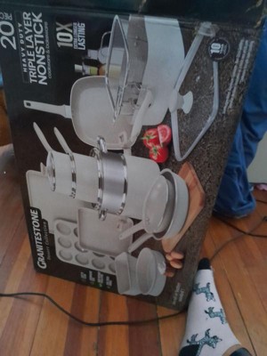 [This review was collected as part of a promotion.] I just received this product that I claimed a few weeks ago. So many good things to say about the Granitestone 20 piece Cookware set. It is heavy duty with out being heavy. The coating on the pans and bakeware prevent burning and the food doesn’t stick. Dishwasher safe too! The variety of items you get in the box is perfect for someone just starting out. Everything you need!