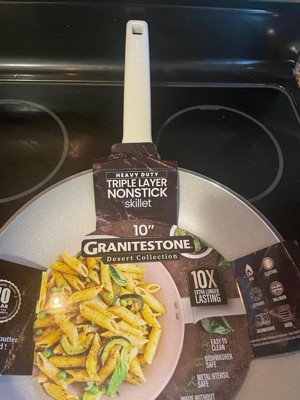 [This review was collected as part of a promotion.] I received and reviewed The Desert Beige 10” Nonstick Fry Pan by Granitestone. I really love this pan. Breakfast has been such an easy task for me lately when cooking with this pan. I love how it is non stick and when making eggs they slide right out! I’ve also cooked a shrimp stir fry with same results. The fact I didn’t have to use any butter or oil and they still had a great taste, is amazing! The pan heats up fast and is very easy to store without taking up too much space. It is very durable and cleaning is very easy. Love my new pan!