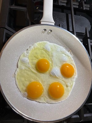 [This review was collected as part of a promotion.] This is a great pan for cooking food (especially ones that tend to stick like eggs). It heats up quickly and withstands high temperatures. It has been easy for me to clean, no scrubbing needed. It is a great size for simple items, not too small not too big. The granite stone is a beautiful paint. It is simple, yet beautiful. My biggest complaint is that it is not clear from PFAS.