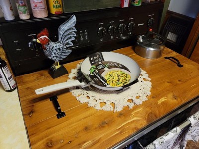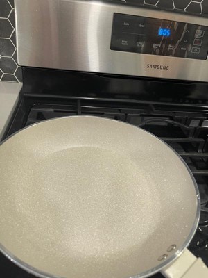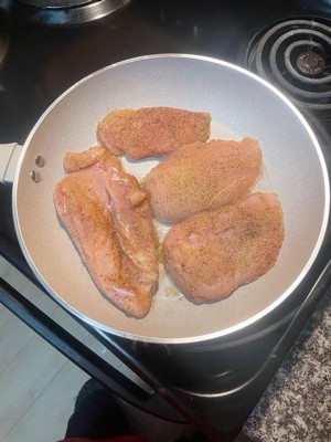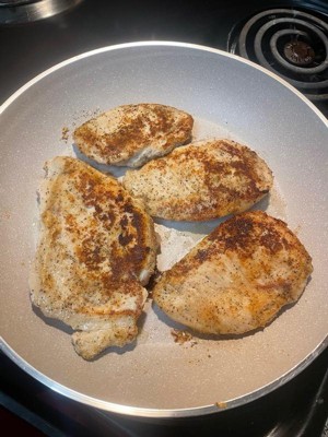 [This review was collected as part of a promotion.] This pan says it doesn’t require any oil or butter and I was very skeptical but wow does it work! My chicken didn’t stick at all and it browned up very nicely. I got to finish cooking the meal in the oven because the pan can go into a 350 degree oven. It didn’t damage it or the handle. It was a very easy clean up. Nothing stuck to the pan. I thought the pan was large enough to handle 6 pieces of chicken at once. The color is beautiful. Not quite white and has more of a cream color. I like that the handle has a cool touch while cooking. I don’t have worry about burning my hand. It’s also supposed to last 10 times longer than your original pan. I’m in love and will be purchasing different sizes.