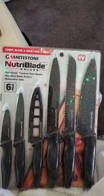 [This review was collected as part of a promotion.] The Granitestone Nutri Blade Knives set of 6 is just what every kitchen needs. Each knife has a job and serve its own purpose. Used the Large knife to chop up onions. Chopped French bread with the bread knife. Sliced chicken breast into tenders with the slicing knife and sliced tomatoes with the pairing knife. These knives are a nice fit to replace any knife set you already have.