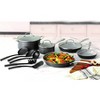 - Components - 8'' Fry Pan, 10'' Fry Pan with Lid, 12'' Fry Pan, 1.5 Qt Saucepan with Lid, 5 Qt Stock Pot with Lid, 5 Piece Utensils