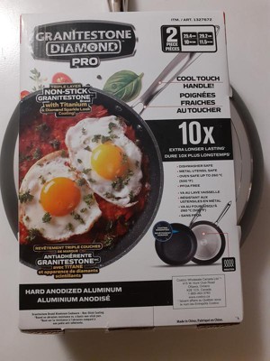 [This review was collected as part of a promotion.] This Granitestone Diamond pro has a coarse feel to it. This is the first time I've used a hard anodized aluminum pan, so I'm not used to the rough coating. With that being said, you can use metal utensils on this pan. The 2 piece pan set measures 10 and 11.5 inches. The larger pan is huge. I don't even have a lid that size. Per instructions, this pan is designed to be used without oil or butter. So I took the liberty of scrambling eggs with cheese without any kind of oil and the eggs stuck. The bottom part of the eggs where like peeling paper. Needless to say, I used butter the second go round and it didn't stick. The instructions did say if you choose to use oil or butter, then cook at low or medium heat. And you can't use non stick sprays. So far, I've cooked bacon, salmon cakes, chicken tenderloins and vegetables in it. And it required oil except the bacon. To me, in order to be a true non-stick pan means no oil or butter. As far as washing, no problem. Food comes off easily and it has a 10 year limited warranty.