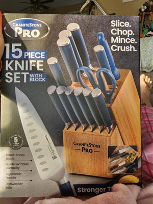 [This review was collected as part of a promotion.] I got Granitestone PRO 15 Piece Knife Set With Block a few days ago and this product is just right because it fits perfect on my countertop, I have all my knives in one place that can slice, chop, crush and mince they have razor-sharp blades, high-quality material, durable, easy/comfortable to hold, and cleans easily. I am very proud to own this product and highly satisfied.