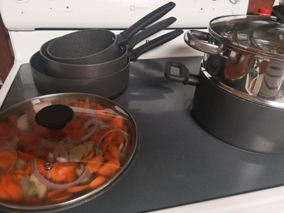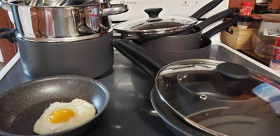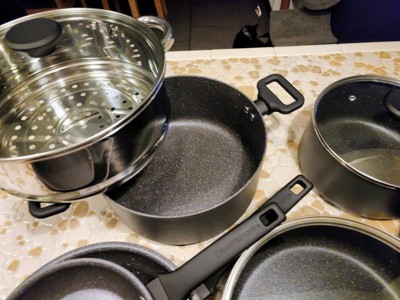 - Comprehensive Set for Every Meal: Includes 8” skillet, 10.25” fry pan with lid, 1 qt, 2 qt, and 3 qt saucepans with lids, 3 qt sauté pan with lid, 5 qt stock pot with lid, and a stainless steel steamer, covering everything from frying to steaming.