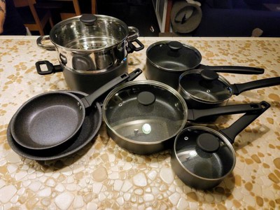 [This review was collected as part of a promotion.] This cookware set has everything you need to make an awesome meal. The quality on these seem to be really good, they appear like they will hold up for a long time. Food doesn't stick to the pots and pans which is always nice. The handles on the pans and lids are great as well. No complaints for this set, they are worth the money!