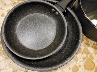 [This review was collected as part of a promotion.] As a mom and wife, who does 99.9% of the cooking in the house, I go through A LOT of pots and pans. I just recently got this set and have to say I love it!! Nothing sticks so it's so easy to turn over the eggs, scramble up some beef, cook the chicken without a mess! They wash up really easy too and my husband even has cooked a few meals because he loves the pans. I'm no longer cussing at the pans for not scrubbing clean or for everything sticking to the bottom! Overall, very happy!!