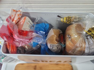 Cute bread box actually holds a full load and a few packs of buns Looks nice on the counter