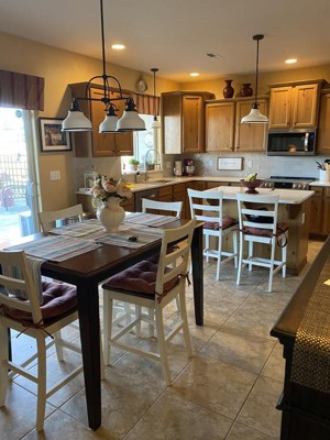 It ties dinning room in well with the 2 Bellevue QZP3993 Hamblen Light 8" Wide Pendants over the kitchen counter.